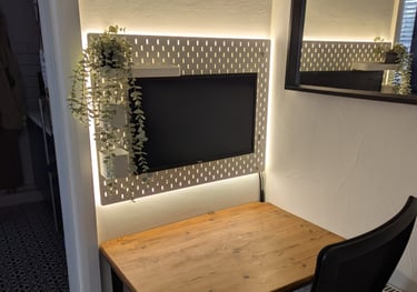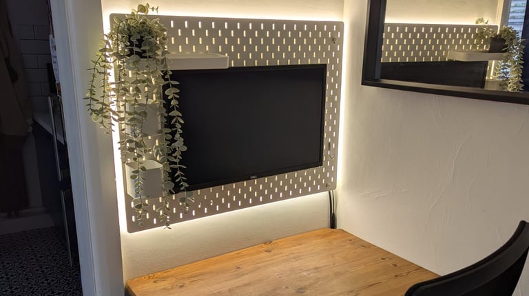 This client had a small untilised area where they wanted to fit a desk. I used a reclaimed desktop and added a modifed Ikea peg board for more storage.