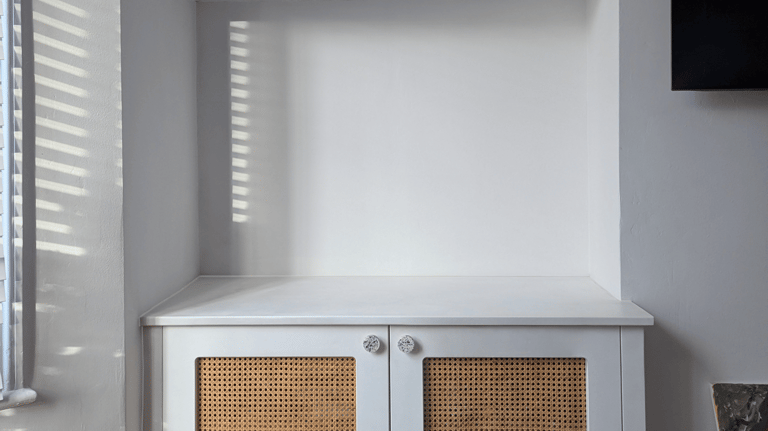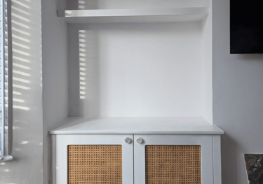 This client wanted a to make use of their alcove, I fitted a cabinet and floating shelves, I added rattan to the doors for a retro feel and painted with a durable white paint.
